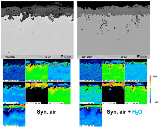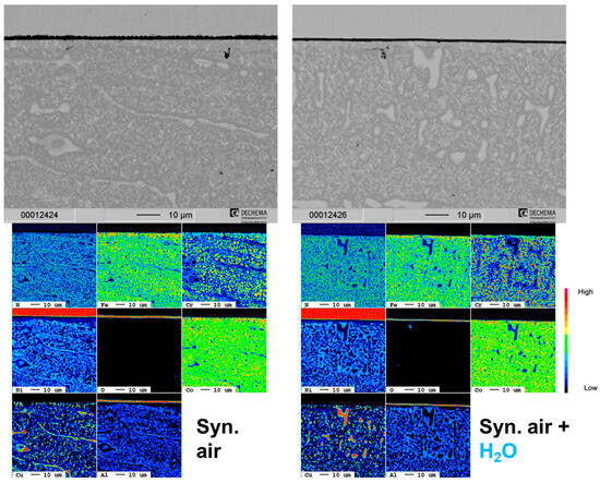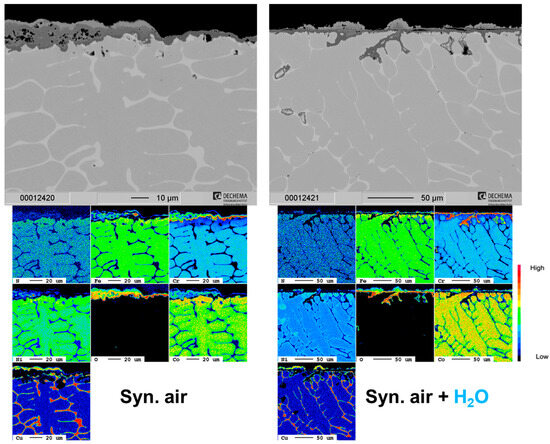 Cross-section SEM images and corresponding EPMA element maps of the HEA+Cu/Al in dry and humid air at 800 °C after 500 h. Synthetic air adapted from [25].