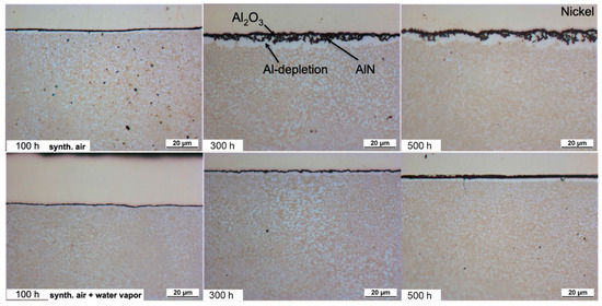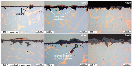 Light microscope images of the cross-sections of the HEA+Cu after exposure at 800 °C for 100, 300 and 500 h. Dry-air images from [25].