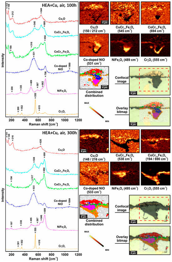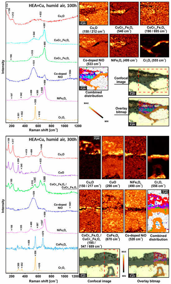 Raman confocal imaging for HEA+Cu after exposure at 800 °C for 100 h in humid air (top) and for 300 h in humid air (bottom). The investigated areas were chosen from optical images presented in Figure 3.