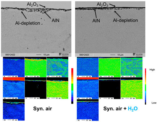 Cross-section SEM images and corresponding EPMA element maps of the HEA+Al in dry and humid air at 800 °C after 500 h. Synthetic air adapted from [25].
