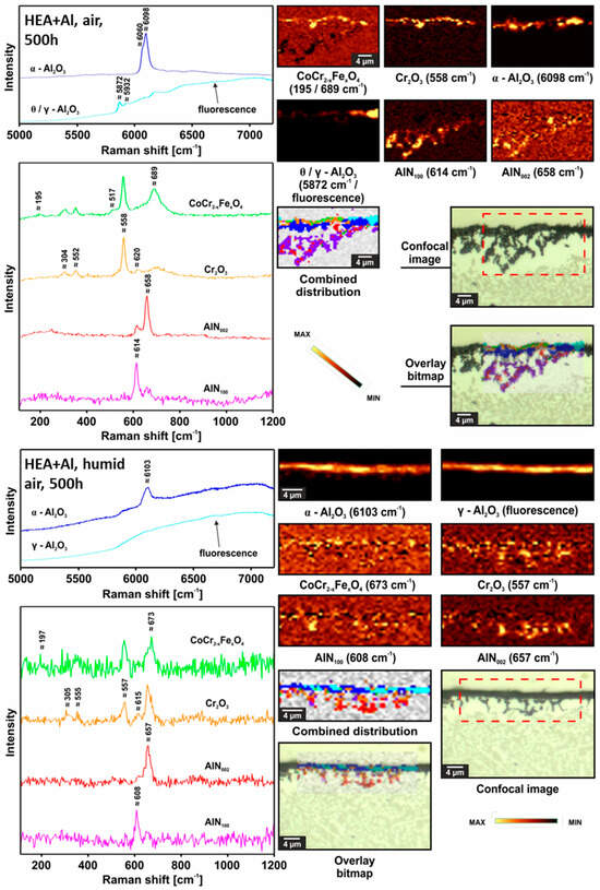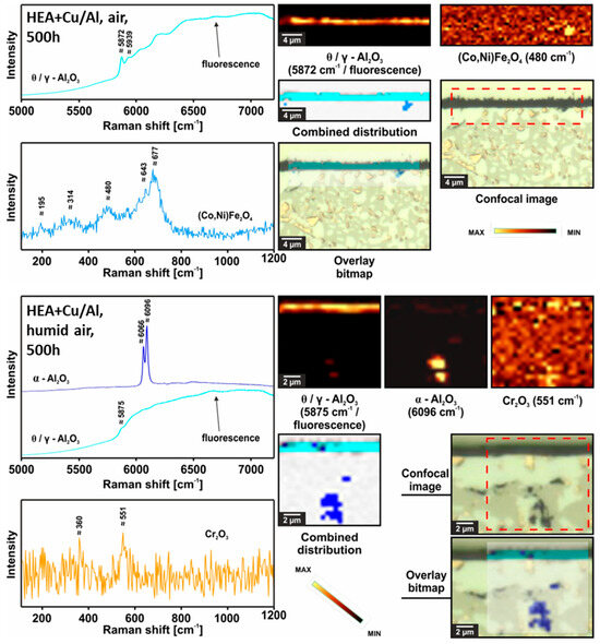 Raman confocal imaging for HEA+Cu/Al after exposure at 800 °C for 500 h in dry air (top) and humid air (bottom). The investigated areas were chosen from the SEM images presented in Figure 8.