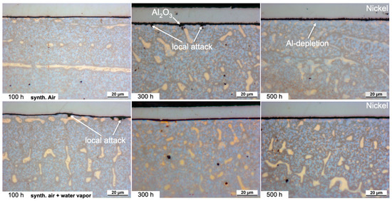 Light microscopic images of the cross-sections of HEA+Al after exposure at 800 °C. Dry-air images from [25].
