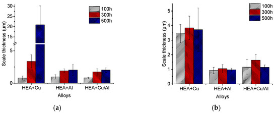 Oxide scale thicknesses of HEA+Cu, HEA+Al and HEA+Cu/Al after exposure for 100, 300 and 500 h at 800 °C in dry (a) and humid (b) synthetic air.