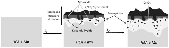 The oxidation mechanisms observed here for the HEA+Mn (Cantor) are in good accordance with the literature [6,7,9,11]. Poor oxidation resistance is primarily characterized by the fast Mn-oxide growth rates leading to severe Mn depletion and formation of Kirkendall voids in the metal subsurface [7,9,11,17]. Mn outward diffusion is ~2 orders of magnitude higher than Cr, Ni and Co [19]. Additionally, oxygen inward diffusion through the outer Mn oxide is relatively high due to the high number of vacancies in the oxide [42].