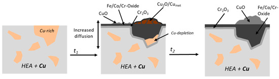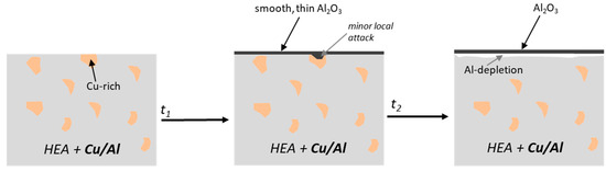 As a result of the thinner and smoother scale, the Al consumption, and thus depletion zone, also appears to be slightly less for the HEA+Cu/Al under water vapor, but this must be confirmed through higher-resolution investigations, such as transmission electron microscopy. It is also possible the Al depletion is confounded by the change in microstructure during exposure. The proposed HEA+Cu/Al humid-air oxidation mechanism is schematically shown in Figure 18.