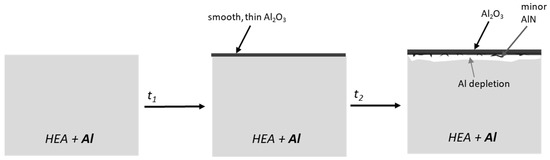The two-phase (BCC and FCC) HEA+Al had significantly better oxidation resistance compared to the HEA+Mn and HEA+Cu alloys, especially in the humid atmosphere. As previously noted, the external alumina scale has a needle-like morphology and becomes thicker and rougher, with some AlN formation and Al depletion in the subscale zone, after 300 h and 500 h at 800 °C in air [25]. After water vapor exposure, the formed external Al2O3 is extremely thin, and a much thinner Al depletion zone becomes evident, showing a very stable, protective oxide layer up to 500 h at 800 °C. Figure 17 summarizes the oxidation behavior of HEA+Al schematically under a humid atmosphere.