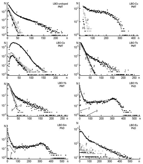 - Baumer, V.N.; Chernikov, V.V.; Dubovik, M.F.; Gavrylyuk, V.P.; Grinyov, B.V.; Grin, L.A.; Korshikova, T.I.; Shekhovtsov, A.N.; Sysoeva, E.P.; Tolmachev, A.V.; et al. Comparative Analysis of Scintillation Parameters Peculiarities of Li2B4O7, LaB3O6, Li6Gd(BO3)3 Single Crystals. Funct. Mater. 2001, 8, 736–741. [Google Scholar]