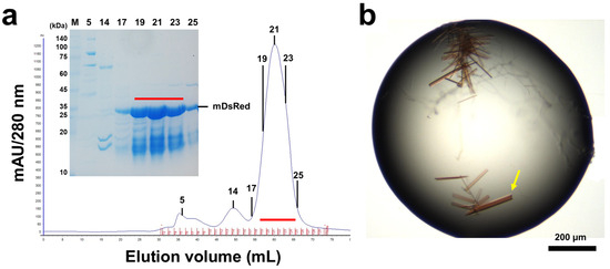 FPs exhibit a stable β-barrel structure, making them highly thermostable with a high melting temperature [45]. Capitalizing on this physical property, heat treatment is often employed during FP purification to denature and remove E. coli-derived proteins that are relatively less heat-stable [46,47]. Therefore, we employed heat treatment to enhance the purity of recombinant mDsRed by eliminating undesired E. coli-derived proteins. After three heat treatments, the supernatant was concentrated and loaded onto a size-exclusion column. The primary peak, which contained mDsRed, was eluted as a monomer (Figure 1a). Larger-sized proteins than mDsRed were effectively removed in the main peak fractions (fraction Nos. 19–23) through the gel filtration column. Meanwhile, proteins smaller than mDsRed were eluted together with mDsRed (Figure 1a). The purity of mDsRed in the fractions used for crystallization was approximately 70–80% (Figure 1a).