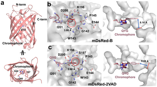 Overall and surface structure of mDsRed. (a) Cartoon representation of mDsRed. Surface structure of (b) mDsRed-B molecules in the asymmetric unit and (c) the previously determined mDsRed (PDB code: 2VAD). Red circle and line indicate the hole between the β7- and β10-strands of mDsRed-B and mDsRed-2VAD.