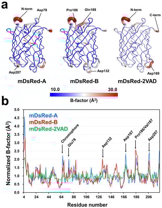 Analysis of the temperature factor of mDsRed structures. (a) B-factor putty representation of mDsRed-A, mDsRed-B, and the previously determined mDsRed (PDB code: 2VAD). (b) Profile of the normalized B-factor for the mDsRed-A (blue), mDsRed-B (red), and mDsRed-2VAD (green).