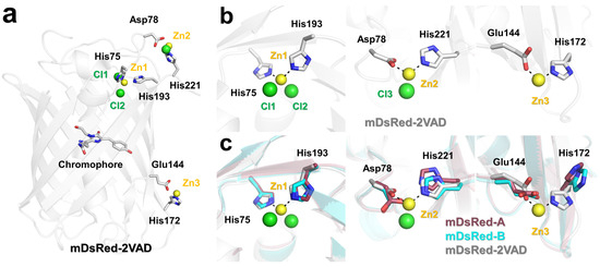 Overall, the position and conformation of His75, Asp78, Glu144, His172, His193, and His221 in mDsRed-2VAD are affected by Zn binding.