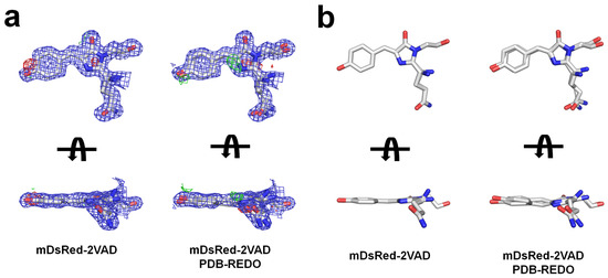 Analysis of mDsRed-2VAD, (a) 2mFo-DFc (blue mesh, 1.0 σ), and mFo-DFc (green mesh, 3.0 σ and red mesh, −3.0 σ) electron density maps for the mDsRed-2VAD and mDsRed-2VAD re-chromophores refined by PDB-REDO. (b) Stick representation of the chromophore in mDsRed-2VAD and mDsRed-2VAD re-refined by PDB-REDO.