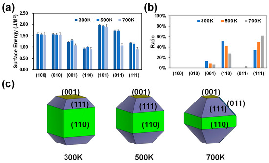 The temperature plays a crucial role in the crystal growth process [36,37]. The growth of crystals requires the right temperature, which can enhance the movement of solute molecules, increase the ease of generating crystal structures, and prevent the deformation of the crystal structure. It should be noted that the current work does not directly study the growth rate of crystals at different temperatures but qualitatively predicts the direction of crystal growth by analyzing the shape and exposed surface of the MFI. MD-MLPs of MFI with different crystal plane orientations were first analyzed at different temperatures, 300 K, 500 K, and 700 K. The calculated surface energies are shown in Figure 1a. There is no doubt that the surface energy of the (110) surface is the lowest among all the surfaces at 300 K (0.93 J/m2; Figure 1a), resulting in the largest surface ratio (52.34%; Figure 1b) and exhibiting the largest area in the equilibrium shape (Figure 1c). In addition, the (111) and (001) surfaces in equilibrium shapes according to Wullf’s theorem appear relatively large (Figure 1c) due to their moderate surface energies (1.19 and 1.22 J/m2, Figure 1a). As shown in Figure 1b, as the temperature increases, the proportion of the (111) surface increases, and the proportions of the (110) and (001) surfaces decrease. Therefore, as the temperature increases, the (111) surface gradually becomes the most dominant surface. Taken together, these findings show that the MFI-type zeolite mainly exposes (110) and (111) surfaces in the absence of external factors, and changes in temperature significantly affect the proportions of (110) and (111) planes. These temperature-dependent differences on the exposed surfaces (110) and (111) are caused by changes in the surface energy. This is due to the increased thermal motion of atoms at higher temperatures, which can lead to a variation in the cohesive forces at the surface. Additionally, changes in temperature can affect the arrangement of atoms at the surface, influencing the overall surface energy.