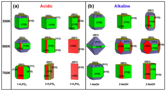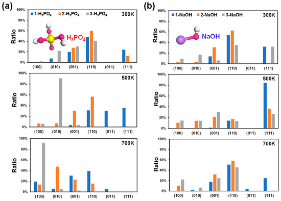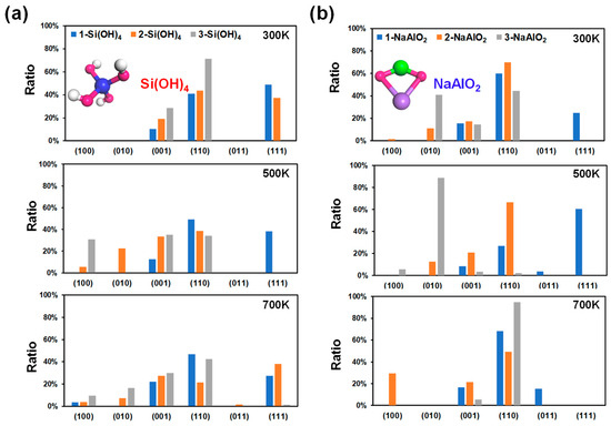 In contrast to acidic environments (Figure 2a), the crystal surface ratio of the (111) plane in the alkaline environment is significantly greater, especially for the 1-NaOH model at 500 K (Figure 2b). However, at high temperatures of 500 K and 700 K, the ratio of the (111) plane decreases with increasing number of NaOH molecules (Figure 2b). That is, the growth of the (111) crystal surface requires reasonable control of the alkaline environment and temperature, and blindly increasing these factors is not suitable for the growth of this surface. The above results indicated that the MFI-type zeolite mainly exposes the (110) surface under alkaline conditions at room temperature, and changes in alkalinity and temperature significantly affect the proportions of (110), (111), and (001) (Figure 3b). The above phenomenon could be attributed to the different interactions between the unsaturated low-value surface and the OH group in the NaOH molecule, as well as the influence of the difference in the pore environment.