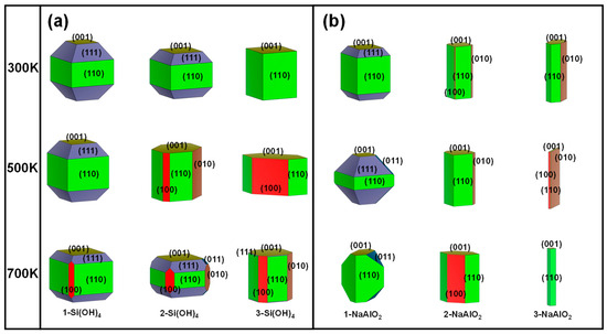 In addition to the acid-base environment, the growth and ablation laws of crystal faces are usually affected by ionic concentration [38]. The different types and concentrations of ions have different effects on the growth of crystals. In particular, the silicon or aluminum (Si/Al) concentration has a great influence on the morphology and catalytic performance (e.g., desulfurization) of ZSM-5 [39]. Herein, different amounts of Si(OH)4 and NaAlO2 were chosen for the Si and Al sources to investigate the effect of the Si/Al concentration on the growth mechanism of MFI. The calculated surface energies, crystal surface ratios, and morphologies of MFI under different Si and Al sources at 300 K, 500 K, and 700 K are shown in Figures S4 and S5, Figure 4 and Figure 5, respectively.