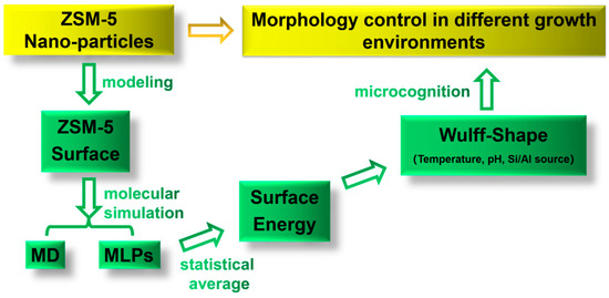 Zeolites with ordered networks of micropores have been extensively applied as heterogeneous catalysts in the petrochemical, fine chemical and coal chemical industries due to their large surface areas, high adsorption capacities, hydrothermal stability, and so on [1,2,3,4]. As an important type of zeolite, ZSM-5 is often used in various catalytic reactions, such as alkylation, aromatization, isomerization, etc., owing to its appropriate acidity and well-defined pore sizes with excellent shape selectivity [5,6,7]. Note that different crystal faces of ZSM-5 have different channel environments, which results in differences in their properties, such as the diffusion of reactants and products, as well as surface acidity [8,9,10]. Thus, it is necessary to study the growth mechanism of ZSM-5, that is, the growth and ablation of crystal faces in different external environments.