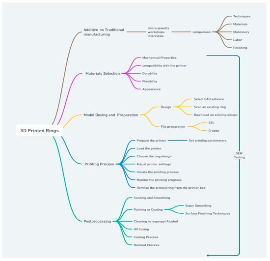 The incorporated insights were directly gathered from the local jewelry industry. All the information illustrated in Figure 2 was obtained through interviews conducted with professionals from three prominent jewelry companies in the city, which provides invaluable insights that enrich the investigative procedures. These discussions with experts unearth specialized knowledge, which is essential for unraveling the intricate technical aspects often overlooked. Moreover, an exploratory analysis delving into regional micro-jewelry workshops dedicated to traditional methodologies complements this understanding. This contextual examination facilitates a comparative evaluation by contrasting conventional techniques with the integration of additive processes within the regional landscape. These meticulous investigations, derived from expert interviews and contextual analyses, not only ensure a comprehensive exploration but also pave the way for a nuanced understanding of the intersection between traditional craftsmanship and modern additive technologies in the jewelry industry.