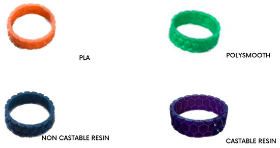 Rings hold a significant and enduring place in the world of jewelry for a variety of cultural, symbolic, and aesthetic reasons [64]. Choosing a ring in a 3D printing design provides a variety of benefits and opportunities, particularly due to the unique characteristics of rings and the potential of 3D printing technology. The ring is printed on three different materials using two different printing methods.