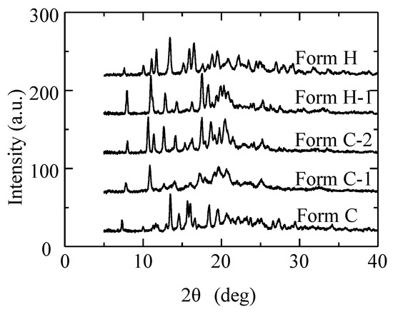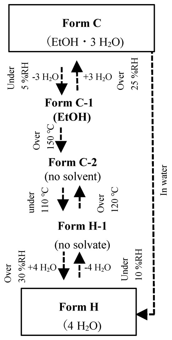 A solid-phase transition of Form C (CS-023·EtOH·3H2O) into Form H (CS-023·4H2O) was performed. At first, Form C-1 (CS-023·EtOH) was obtained by placing Form C under less than 5% RH. Then, by heating Form C-1 to 150–180 °C, the solvate-free polymorph, Form C-2, was obtained. Form C-2 was transformed into Form H-1 by cooling it down to 110 °C. Finally, Form H-1 changed to Form H as described in the previous paper [15]. As a result, the hydrate polymorph was recovered without exposing Form C to bulk water, with no risk of hydrolysis of CS-023′s β-lactam structure. This is a merit of adopting the solid-phase transition for the polymorph change.
