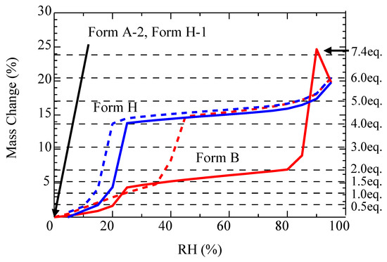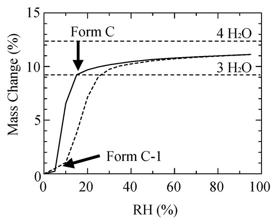 Vapor absorption and desorption isotherms of crystalline materials were determined using DVS advantage-1 (Surface Measurement Systems Ltd., London, UK) in a relative humidity range of 0–95% at intervals of 5%. The equilibrium criterion for each step was that the weight change should be less than 0.001% for 5 min.