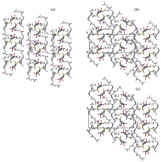 The three polymorphs are composed of similar helical chain structures as follows. Figure 6 presents the mutual relationship between three helix chains (named A-, B-, and C-chains) composed of the three polymorphs: (a) Form A, (b) Form C, and (c) Form H. However, solvent molecules, namely water and ethanol, are omitted here for the simple look of the three polymorph structures. Our eyes are on the ab-plane of the Form A crystal lattice (panel (a)) and the ac-plane in Form C’s and Form H’s crystal lattice (panels (b) and (c)). Each molecule in each helix is given a number from one to six. In Form A, the three-helix chains point in the same direction. The tail (as shown in Figure 1) is positioned in the background on the paper. The direction from tail to head is left-handed.