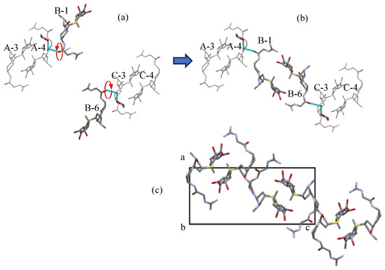 A possible mechanism of the solid-phase transition of Form A into Form H. The rotation of two CS-023 molecules (B-1 and B-6) in Form A results in the formation of a similar structure with Form H: (a) the B-1 and B-6 molecules shown in Figure 6a, (b) the relationship between the B-1 and B-6 molecules after those rotations, and (c) the mutual relationship between the three helix chains in Form H represented as a reference of Form 7 (b). The unit cell is written as a black rectangle.