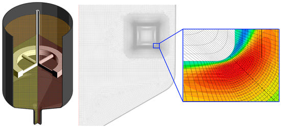 The oscillation amplitude of a ring-baffle (Figure 2) was 0.1 mm and the oscillation frequency was 50 Hz. Calculation of oscillatory motion requires the choice of a minor step size for accurate calculation of the velocity field. In our calculation, its size was 1/400 of the oscillation period (5 × 10−5 s), optimized for the AVC technique described earlier []. The calculation was carried out until a stationary temperature distribution in the liquid was achieved, which took 60 s.