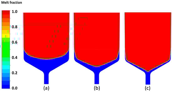 Crystallized part of the melt at VGF growth of CdTe at cooling rates 0.2 K/h (a); 1.0 K/h (b); 5.0 K/h (c), when the “tails” reached 8 cm height from the crucible bottom (For animation of crystallization processes see Videos S1–S3).