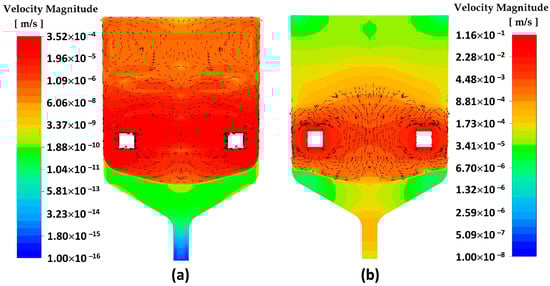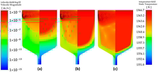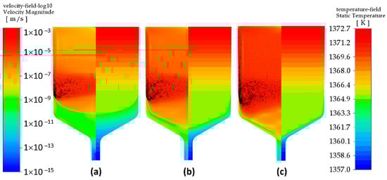 Two parts of the crystallization front can be distinguished: central and peripheral. Note that they have different curvature, and this is explained by the influence of the thermal effect of crystallization. Indeed, if we imagine that crystallization occurs without a thermal effect, then the curvature of the crystallization front is determined solely by the ratio of thermal conductivities in the melt and crystal (see Ref. []). However, taking into account the crystallization heat significantly increases the sagging of the front, and leads to the appearance of a linear “tail” part of the crystal at the periphery of the crucible. Figure 4 shows the velocity field in a logarithmic scale (on the left) and the temperature field (on the right) with the “tails” positioned at a height of 8 cm from the bottom of the crucible. Similar fields are shown in Figure 5 at a distance of 14 cm from the bottom of the crucible.