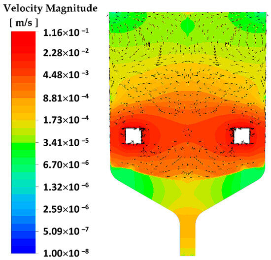 Velocity field colored by magnitude after 9 × 104 s of CdTe VGF crystal growth at AVC action with 50 Hz frequency and 0.1 mm amplitude.