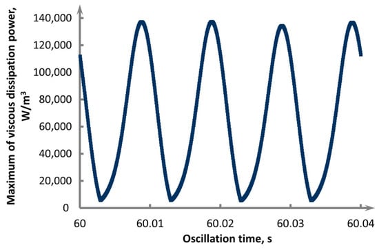 The maximum power of viscous dissipation during our ring-baffle oscillation (Figure 10), however, does not allow the required indicators to be achieved. This value was nearly in order less (1.4 × 105 W/m3) than in the case of a plane disk. This is explained by the fact that the movement of the melt when the ring-baffle oscillates is freer than when the plane disk oscillates. There is much less friction between the layers of the moving liquid, because the mass transfer of the liquid melt occurs when the disk oscillates only through the area between the melt and the wall, which leads to an increase in energy viscous dissipation.