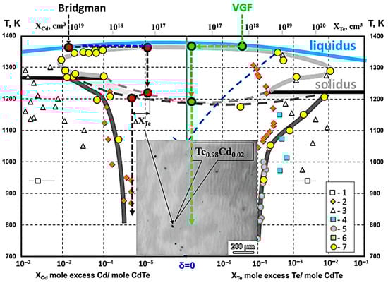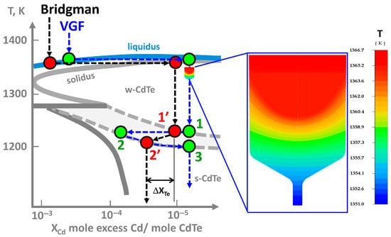 When comparing Bridgman and VGF processes (Figure 12, red circles) due to the very low crystallization rate of the VGF technique (Figure 12, green circles), the grown CdTe crystal after the full crystallization from point (1) will be in the field of w-CdTe (see the insertion in Figure 12). With further slow cooling, it is possible to go through the polymorph transition, achieving the equilibrium state by moving sequentially from point (2) to point (3) and then to point (4), followed by the further crystal annealing. Whereas when using the Bridgman technique, the crystallization starts from (1′) point and ends at (2′) point. At a comparatively fast cooling rate and high temperature gradient (20 K/cm []) we move from point (2′) to point (3′), and further crystal cooling Te micro precipitations (ΔXTe) form, resulting from the decay of oversaturated Cd-rich nonstoichiometric solid solution.