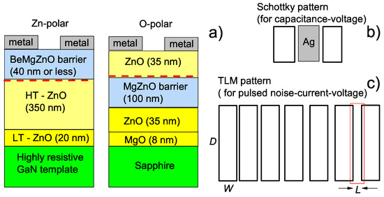 Cross sections of the samples are presented in Figure 1a. In Zn-polar structures, 2DEG forms near the bottom surface of BeMgZnO barrier, while in O-polar structures it forms near upper surface of MgZnO barrier (2DEG is indicated by red dashed lines). The formation of 2DEG is mainly determined by the discontinuity of polarization at the heterointerface. In the case of Zn-polar growth, the discontinuity of polarization creates a positively charged surface at the bottom surface of the BeMgZnO barrier layer, resulting in the formation of 2DEG in the ZnO layer adjacent to the heterointerface. In the case of O-polar growth, the positively charged surface is at the top of the MgZnO barrier layer, giving rise to the 2DEG channel in ZnO just above the heterointerface. Therefore, the differences in the position of 2DEG are due to differences in growth polarity. A more detailed discussion of the 2DEG formation in the Zn- and O-polar ZnO/(Be)MgZnO interfaces can be found in the work of Ding et al. [35]. The same principle works for the GaN-based systems of Ga-polar and N-polar growth [36,37].