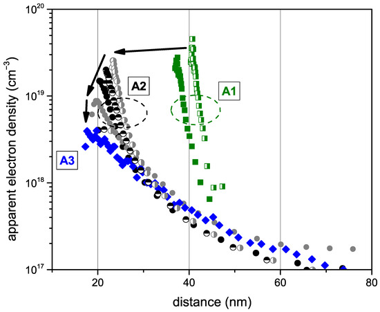 Electron density profile measurements for heterostructures with different barrier thicknesses are presented in Figure 2. The peaks show the formation of 2DEG near BeMgZnO/ZnO interfaces and the position of the peaks reveals the thickness of the BeMgZnO barrier layer. The peaks slowly diminish as the barrier thickness is decreased from approximately ∼40 nm to ≲20 nm. So, the electron gas confinement becomes poor at barrier thickness of ≲20 nm. A similar tendency was also observed in GaN-based heterostructures [39,40]. A further decrease in barrier thickness results in the disappearance of the 2DEG peak (Figure 3). The electron density profiles of thin-barrier heterostructures of different bulk electron densities in ZnO layer are presented in Figure 3. There is some small variation in the barrier thickness per sample (see the group of sample A2 in Figure 2 as an example). The same variation in sample B1 gives a weak onset of the 2DEG peak, while for slightly larger barrier thickness, the peak almost disappears (Figure 3). The variation of bulk electron density in the ZnO layer also can have an affect on the peak formation.