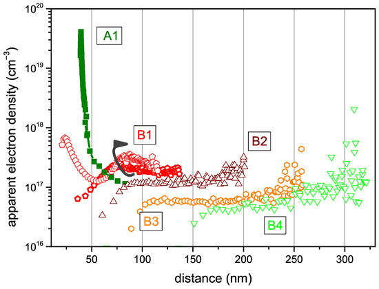 The dependence of apparent electron density on the distance for thin-barrier layer BeMgZnO/ZnO heterostructures of different bulk electron density in ZnO layer. Pentagons, up-triangles, hexagons and down-triangles stand for thin-barrier samples B1, B2, B3 and B4, respectively. Sample A1 with a thick-barrier layer is shown for reference.