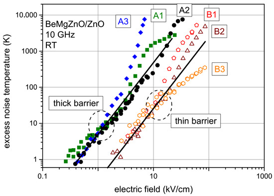 The dependence of excess noise temperature on electric field in BeMgZnO/ZnO heterostructures. Closed and open symbols stand for thick-barrier and thin-barrier samples, respectively. Lines are .