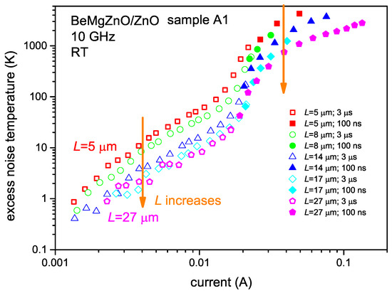 The dependence of excess noise temperature on current for different channel lengths (5 m–27 m) in thick-barrier BeMgZnO/ZnO sample A1. Pulse length is 3 s (open symbols) and 100 ns (closed symbols).