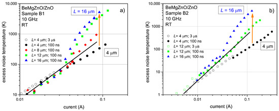 As was noted, thin-barrier samples B1 (n) and B2 (n) show opposite dependence on L (see Figure 6, at I > 35 mA, for samples B1 and B2) than in the thick-barrier sample A1. The threshold-like onset of noise temperature shows up for all channels with L > 4 m of samples B1 and B2. The noise onset is stronger for the longer channels in which excess noise temperature lifts over the line, plotted through experimental noise points at low bias, forming bump-like dependence. A similar trend was observed in bulk Ga-doped ZnO films of different 3D electron densities and it was attributed to the high-field domain formation [42]. The formation was resolved for the Hall electron density range of – , while at a densities above that range, as well as in the case of ZnO-based 2DEG channels, it was not. Therefore, microwave noise in thin-barrier samples B1 and B2 resembles that of bulk films. This also agrees with C–V profiling plots in Figure 3, in which no 2DEG is observed and 3D electrons dominate.