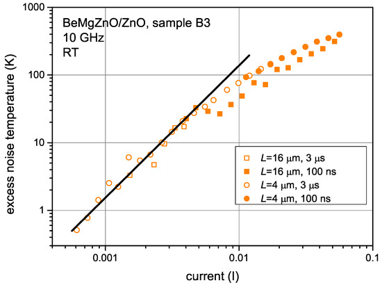 The dependence of excess noise temperature on current in BeMgZnO/ZnO sample B3 for different channel lengths. Pulse length is 3 s (open symbols) and 100 ns (closed symbols).