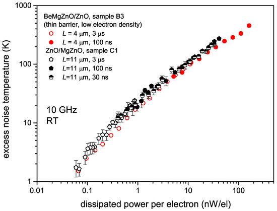 It is important to note that the dependence of excess noise temperature on dissipated power per electron of sample B3 is close to that of the 2DEG ZnO/MgZnO channel (Figure 8). Dissipated power is estimated from the current and voltage pulse amplitudes, I and U, and a number of electrons N in the conductive channel obtained from the Hall measurements. There is no dependence on pulse length, which means that self-heating (Joule heating) is controlled by using short pulses.