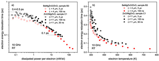 The dependence of electron energy relaxation time on dissipated power per electron is depicted in Figure 9a. At lower dissipated power of ∼0.1 nW/el, the electron energy relaxation time is ∼0.4 ps–0.5 ps for the ZnO/MgZnO channel and slightly lower (∼0.35 ps) for thin-barrier BeMgZnO/ZnO/GaN sample B3. At higher dissipated power (and higher excess electron temperature), the relaxation rate increases, and reaches ∼0.1 ps as exceeds ∼10 nW/el. The obtained values ∼0.1 ps–0.5 ps are comparable with those estimated for Ga-doped bulk ZnO films of electron densities < [16].