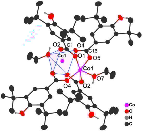 High interest in coordination compounds based on paramagnetic 3d metal ions is caused by the origination of unique magnetic responses, paving the way to a solution of fundamental as well as practical tasks of different complexities [1,2,3,4,5,6]. The anisotropy of g-tensor parameters, reversible transitions from the low- to the high-spin state of metal centers, as well as exchange interactions between metal centers, stimulating magnetic ordering in the crystal, etc., may be useful for creating memory elements [7,8,9], optical sensors [10], and soft mechanical actuators [11]. High-spin cobalt(II) ions have maximum magnetic anisotropy in a number of 3d metals [12,13,14,15], which makes them a promising platform for the effective tuning of axial magnetic anisotropy through a crystal field and obtaining compounds exhibiting slow magnetic relaxation.