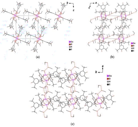 In the crystal, dimeric molecules form a supramolecular chain (Co…Comin 12.469 Å) along the 0b axis through the C-H…π interaction between the methyl proton of the tert-butyl group and the benzene ring of the carboxylate anion (Figure 2, Table S2). Along the axes, the crystal packing is augmented by the intermolecular O-H…O interactions of solvated ethanol molecules as well as by C-H…π contacts (Figure 2, Tables S1 and S2). The Co1Co1 vector of the dimer fragment is co-directional to the 0a axis, and a chain of dimers (Co…Comin 8.945 Å) contacting through the H-bonds of coordinated and solvated ethanol molecules is lined up along it (Figure 2, Table S1). The nearest distance between the metal atoms of adjacent molecules located along the 0c axis and interacting only due to van der Waals contacts is 12.988 Å (Figure 2).