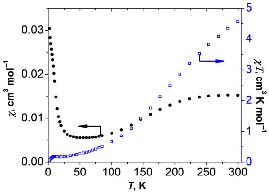The results of the study of magnetic properties of 1 are presented in Figure 4. The value of χT at 300 K is 4.57 cm3·K·mol−1, which is significantly lower than the theoretical value of 6.85 cm3·K·mol−1 for two noninteracting Co(II) ions with spin S = 3/2. Upon temperature lowering, χT decreases, reaching a small plateau at ~0.16–0.18 cm3·K·mol−1 below 25 K, which indicates the presence of strong antiferromagnetic exchange interactions leading to the compensation of spins in the binuclear molecule and, as a consequence, to the diamagnetic ground state. Non-zero values of χT below 25 K are associated with the presence of a small amount of paramagnetic impurity (p < 3%). The repeated studies of the magnetic susceptibility of the newly obtained sample 1 confirmed the reproducibility of the observed magnetic data. The presence of a significant orbital contribution to the magnetic susceptibility (that is common for Co(II) ions) complicates the analysis of experimental data. Simultaneous consideration of spin-orbital and exchange interactions leads to overparameterization, which prevents correct values of the energy of exchange interactions in the dimer from being obtained.