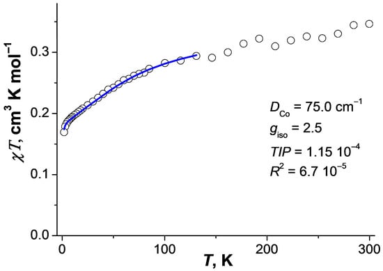The magnetic behavior of the diamagnetically diluted sample 3 is strongly different from that of binuclear complex 1. The χT value of 3 at room temperature is 0.35 cm3·K·mol−1, which corresponds to the cobalt(II) ion content of ~3% in the sample. As the temperature decreases, the value of χT decreases gradually to 0.17 cm3·K·mol−1 at 2 K (Figure 5). Analysis of the χT(T) dependence in the temperature range 2–130 K allows us to estimate the magnetic anisotropy parameter D. The optimal value of D obtained by analysis in the framework of the spin Hamiltonian (3) taking into account the correction for temperature-independent paramagnetism (TIP) is 75.0 cm−1 at giso = 2.5 and TIP = 1.15 × 10−4 (R2 = 6.7 × 10−5).