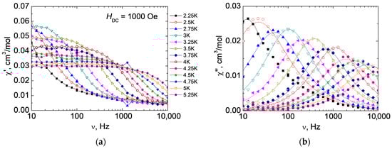 Frequency dependences of the real (χ′) (a) and imaginary (χ″) (b) parts of the dynamic magnetic susceptibility of 3 at 2.25–5.25 K in 1000 Oe external DC magnetic field. Solid lines—approximation of experimental data using the generalized Debye model.