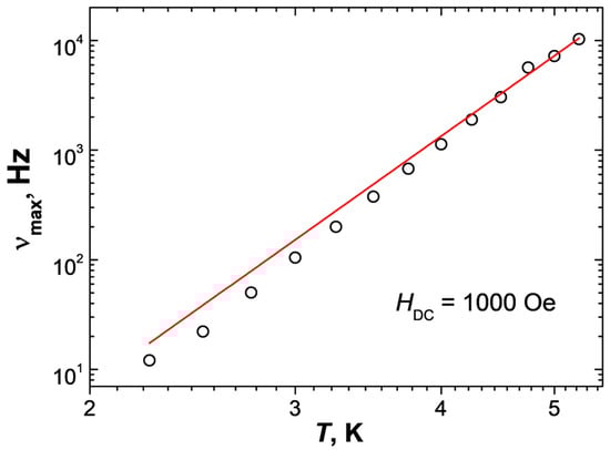 Temperature dependence of relaxation frequency for 3 in 1000 Oe dc-field. Red solid line—approximation using the Raman mechanism.
