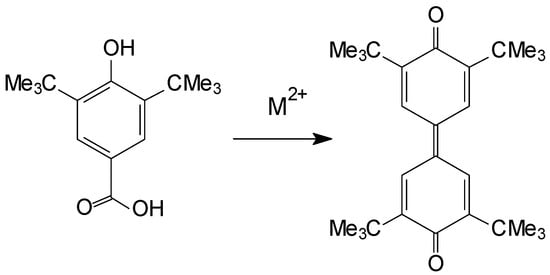 It is worth noting that compounds based on 3,5-di(tert-butyl)-4-hydroxybenzoic acid exhibit redox-active behavior. Firstly, a catalytically promoted oxidation of Hbhbz to 2,6-di-tert-butylhydroquinone with cobalt(II) and nickel(II) salts followed by decarboxylation and recombination into diquinone was previously shown [23,25] (Scheme 1). Secondly, the presence of an oxidant can generate a stable radical from bhbz, which was previously shown on a nickel(II) complex with a coordinated bhbz anion [26]. These factors needed to be taken into account during the synthesis of 1–3, and the reactions were carried out in an inert atmosphere at room temperature.