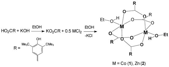 General procedure. Potassium 3,5-di-tert-butyl-4-hydroxybenzoate Kbhbz was generated in situ by the reaction of KOH (112 mg, 2 mmol) and Hbhbz (500 mg, 2 mmol) in EtOH (15 mL). The solution of Kbhbz was added to a solution of CoCl2∙6H2O or anhydrous ZnCl2 (1 mmol) in EtOH (25 mL) in an inert atmosphere. The reaction mixture was kept at room temperature for 30 min upon stirring, and then it was filtered from KCI. The residual solution was kept at room temperature in an inert atmosphere.