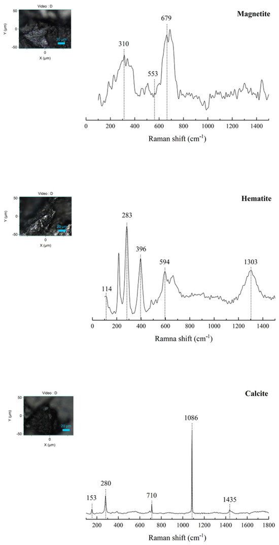 The Raman spectrum of inclusions shows that the black opaque inclusions of Pakistani demantoids are magnetite, which is consistent with the results obtained by Palke et al. from LA-ICP-MS (laser ablation (microprobe) inductively coupled plasma mass spectrometry, an instrument for detecting chemical composition.) testing on black inclusions [10]. Taking the Raman spectrum of sample P3 (Figure 5) as an example. The Raman spectrum shows the characteristic absorption peaks at 310 cm−1, 553 cm−1, and 679 cm−1 of magnetite, which agree with magnetite from the RRUFF online database. In addition, hematite and calcite were also detected among the inclusions. Hematite inclusions: Characteristic absorption peaks at 114 cm−1, 283 cm−1, 396 cm−1, 594 cm−1, and 1303 cm−1 can be seen. Calcite inclusions: characteristic absorption peaks at 153 cm−1, 280 cm−1, 710 cm−1, 1086 cm−1, and 1435 cm−1 can be seen.